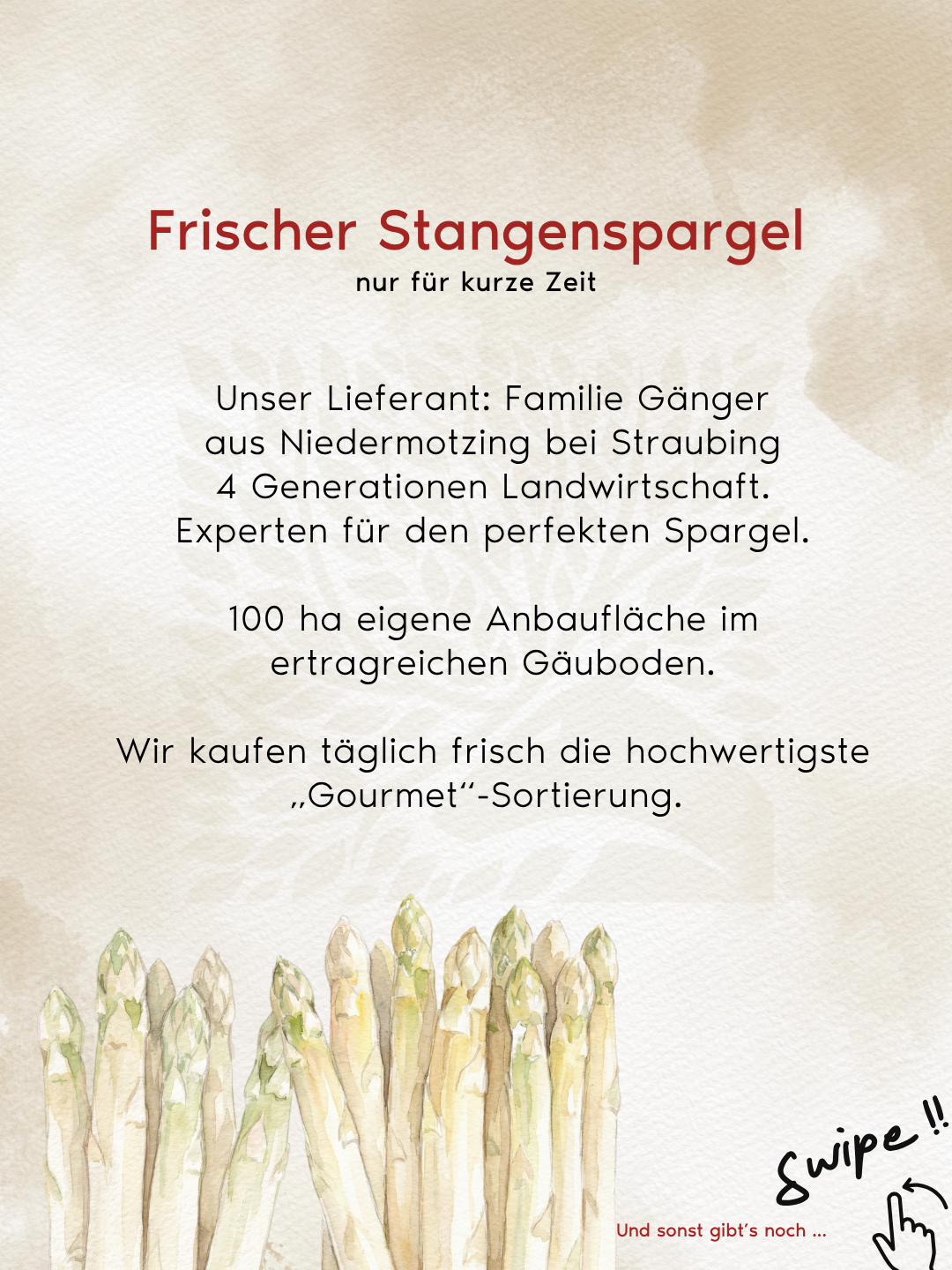 Unser Spargel stammt von der Familie Gänger aus Niedermotzing bei Straubing, einem traditionsreichen Familienbetrieb mit über vier Generationen Erfahrung.