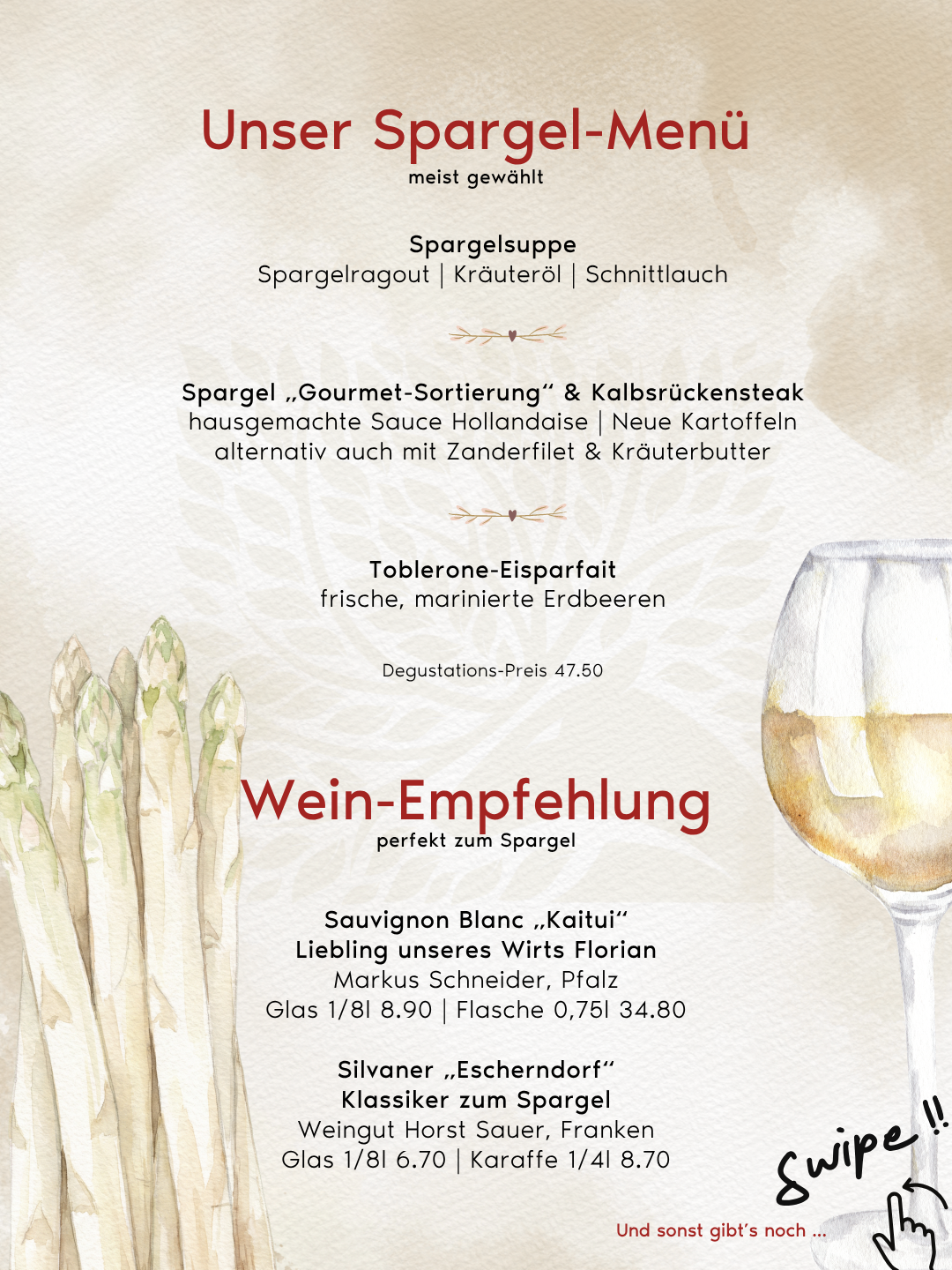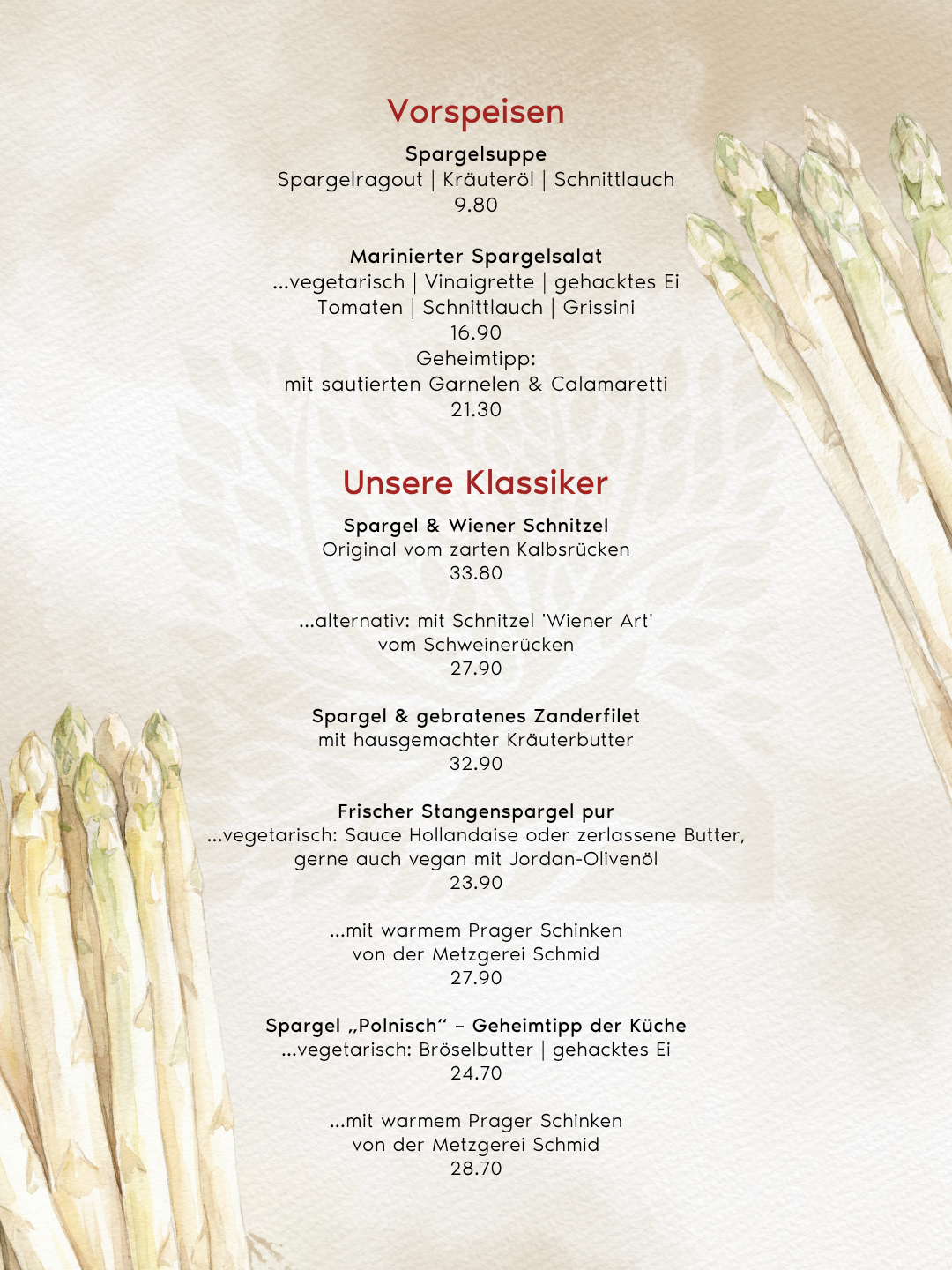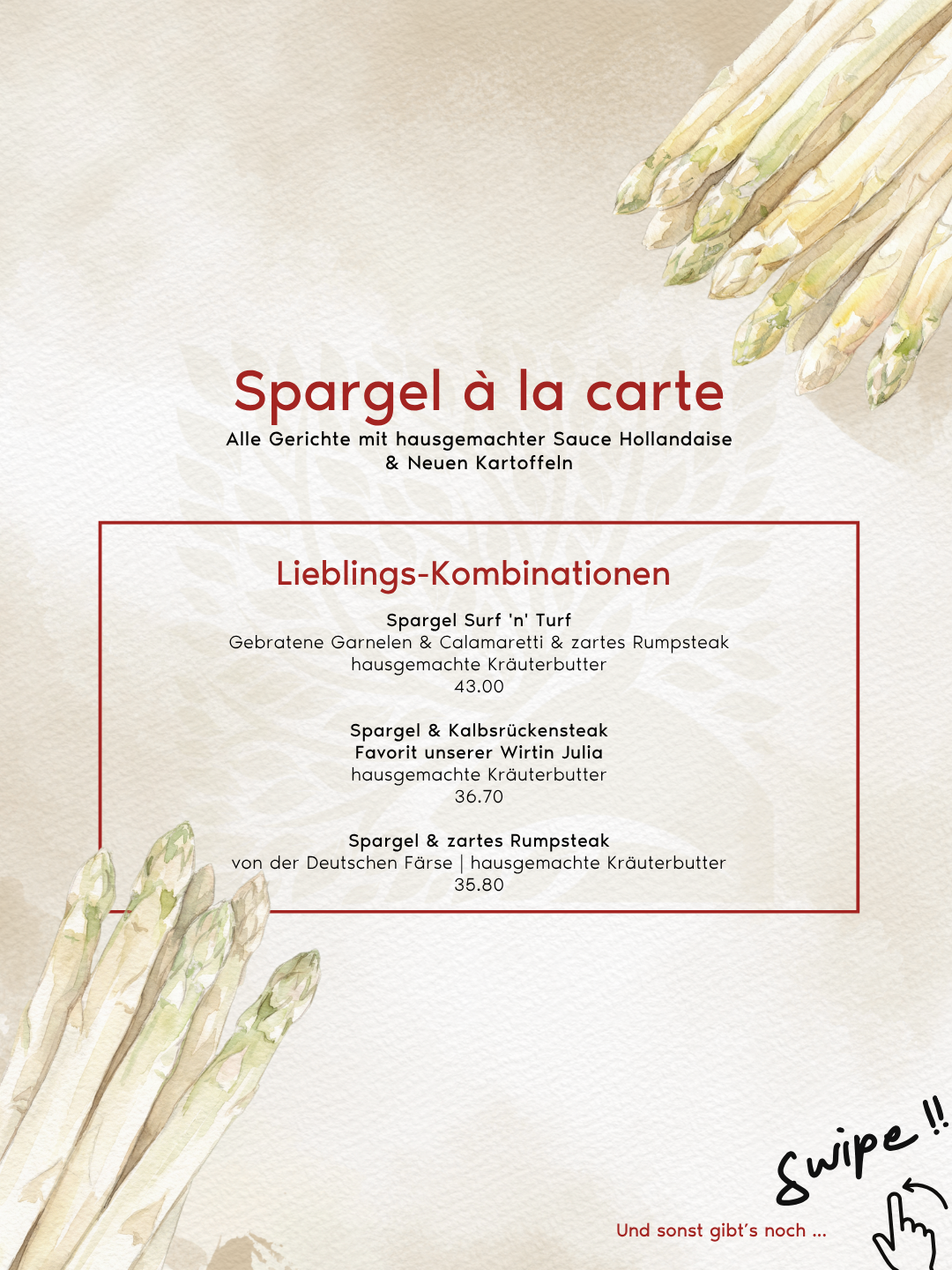 Ob klassisch, herzhaft oder etwas ausgefallener – unsere Spargelkarte bietet für jeden Geschmack die passende Kombination: