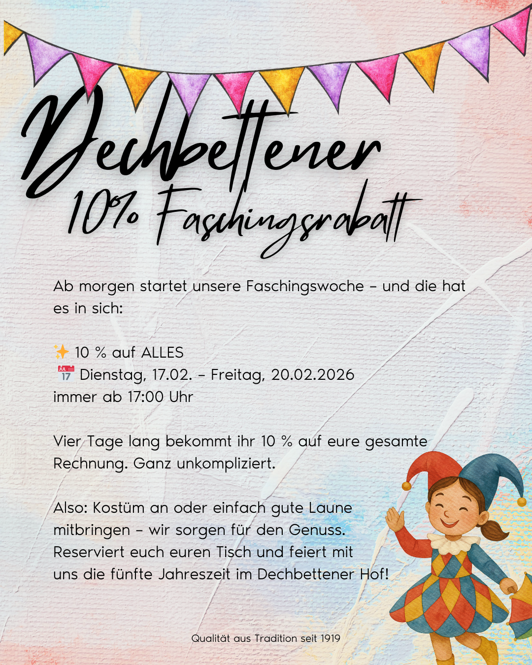Die fünfte Jahreszeit ist da – und wer stilvoll Faschingfeiern in Regensburg möchte, findet im Dechbettener Hof den perfekten Rahmen: gemütlich, genussvoll und mit einem besonderen Vorteil.